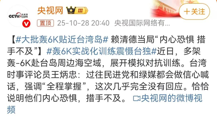 据央视网消息,近日,多架轰-6K赴台岛周边海空域,展开模拟对抗训练。