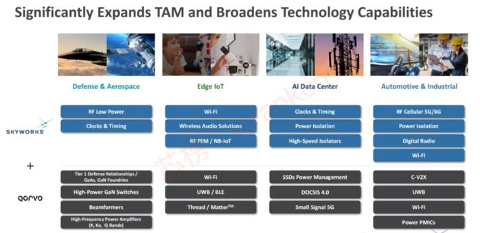 新Skyworks计划把Qorvo的高功率GaN、UWB、卫星通信资产打包,推出“射频-天线-汽车/军工”跨场景平台,用“多市场组合包”对抗高通的“单手机市场包”,避开纯手机赛道的价格血拼。新Skyworks长远的战略意图正是要在“高通+博通”双寡头闭环之外,打造第三个具备全频段、全场景、全客户覆盖能力的射频超级平台,以规模换研发、以组合包对抗一体化,从而在全球射频前端市场重新拿到定价权和估值重定价权。