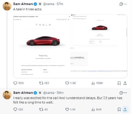 奥特曼以讽刺的口吻写道:“我真的为这辆车感到兴奋!我理解延误。但7年半的时间似乎太长了。”
