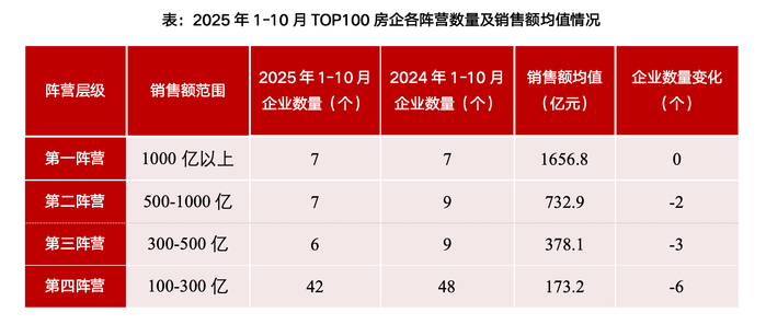 从各阵营房企情况看,前十月TOP10房企销售额均值为1430.9亿元,同比下降15.0%;TOP11~30房企销售额均值为355.1亿元,同比下降17.8%;TOP31~50房企销售均值为172.1亿元,同比下降16.6%。