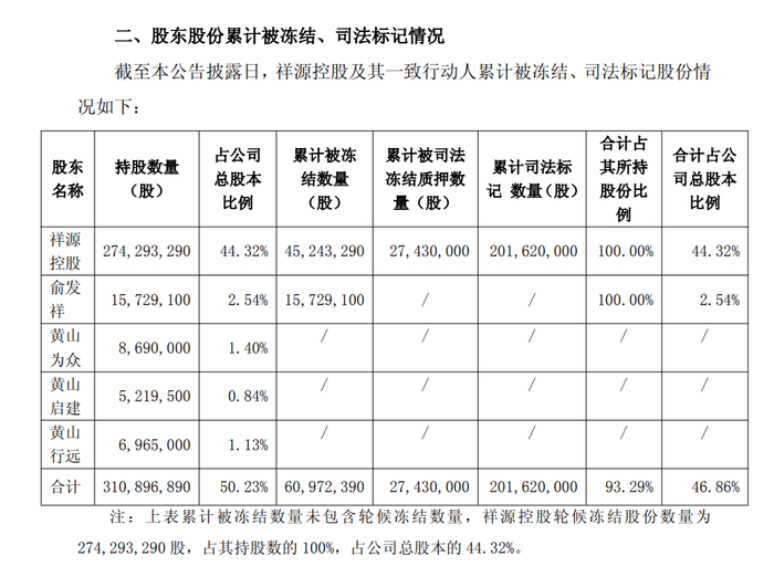 截至本公告日,祥源控股持有公司股份274,293,290股,占公司总股本的44.32%。祥源控股被司法冻结股份数量45,243,290股,占公司总股本的7.31%;被司法冻结质押27,430,000股,占公司总股本的4.43%;被司法标记股份数量为201,620,000股,占公司总股本的32.58%;被轮候冻结274,293,290股,占公司总股本的44.32%。实际控制人俞发祥持有公司股份15,729,100股,俞发祥被司法冻结股份数量15,729,100股,占公司总股本的2.54%。