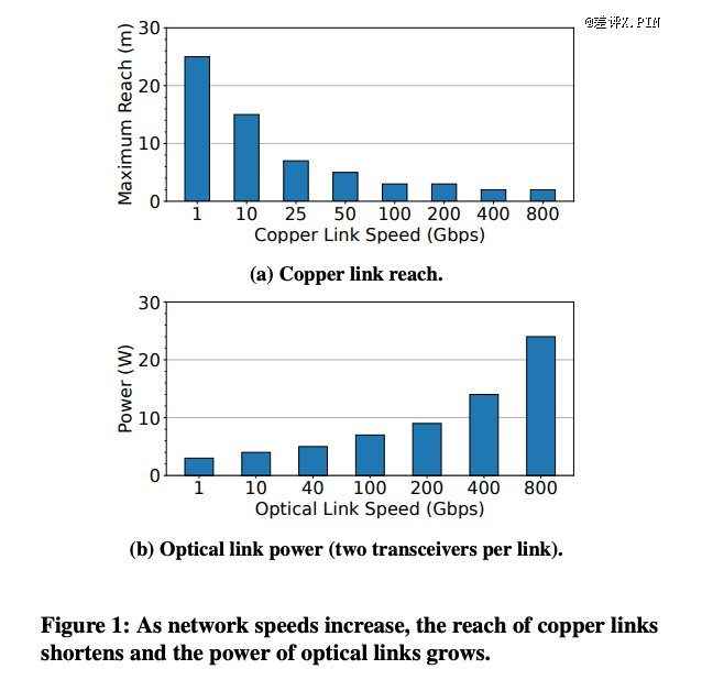 随着传输速率增加,铜缆有效距离逐渐缩短(a)、光纤功耗逐渐增加(b)