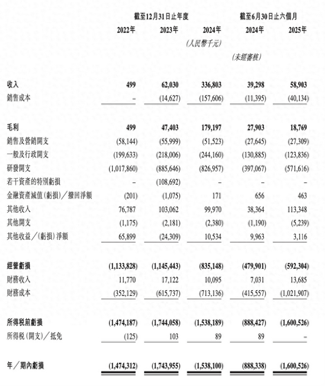 2025年1-6月,公司营收持续增长至5890.3万元,较上年同期的3929.8万元同比增长49.9%;但净亏损有所扩大,期内亏损16.01亿元,同比扩大超80%,经调整年内亏损为5.5亿元。2022年至2025年6月,公司累计净亏损已超63亿元。同期毛利率分别为100%、76.4%、53.2%、71.0%及31.9%。