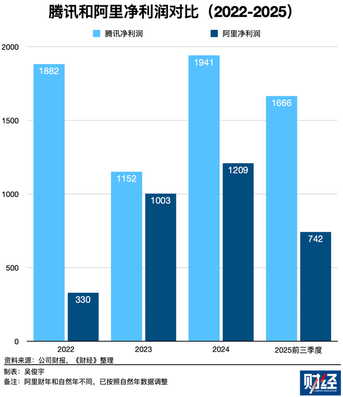 包括腾讯云等业务部门在内的多位腾讯人士对《财经》曾表达过焦虑情绪。在他们看来,腾讯和阿里、字节跳动都是第一梯队的科技公司,却没有自研出与自身行业地位相匹配的大语言模型。腾讯每年净利润远超阿里(备注:2024年腾讯集团净利润1941亿元,同期阿里集团净利润1209亿元),应该把利润投入大模型训练等AI前沿领域。