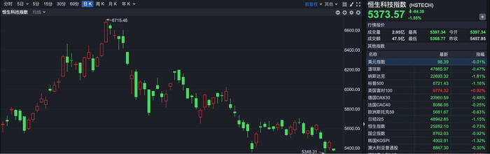 恒生科技指数报5373.57点,下跌84.38点,跌幅1.55%。